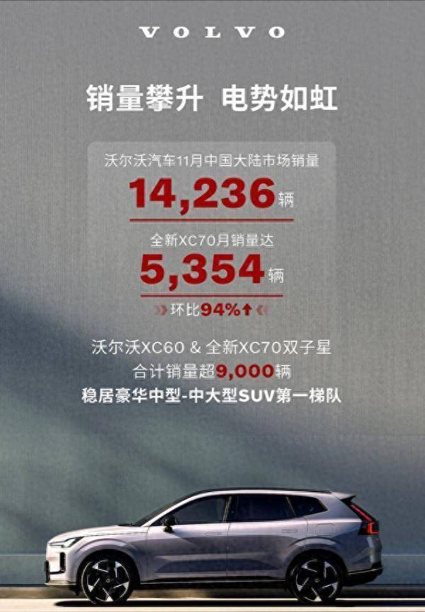 如果说2025年豪华车市场谁比较受欢迎,喵哥觉得沃尔沃全新XC70可以有一个席位,这款9月26日才正式上市的车型,10月还在积累口碑,11月销量就达到5354辆,环比增长94%,上市第二个完整月就成为了沃尔沃品牌销冠,截至11月底累计销量已达到9211辆,距离月销万辆的成绩不远了。